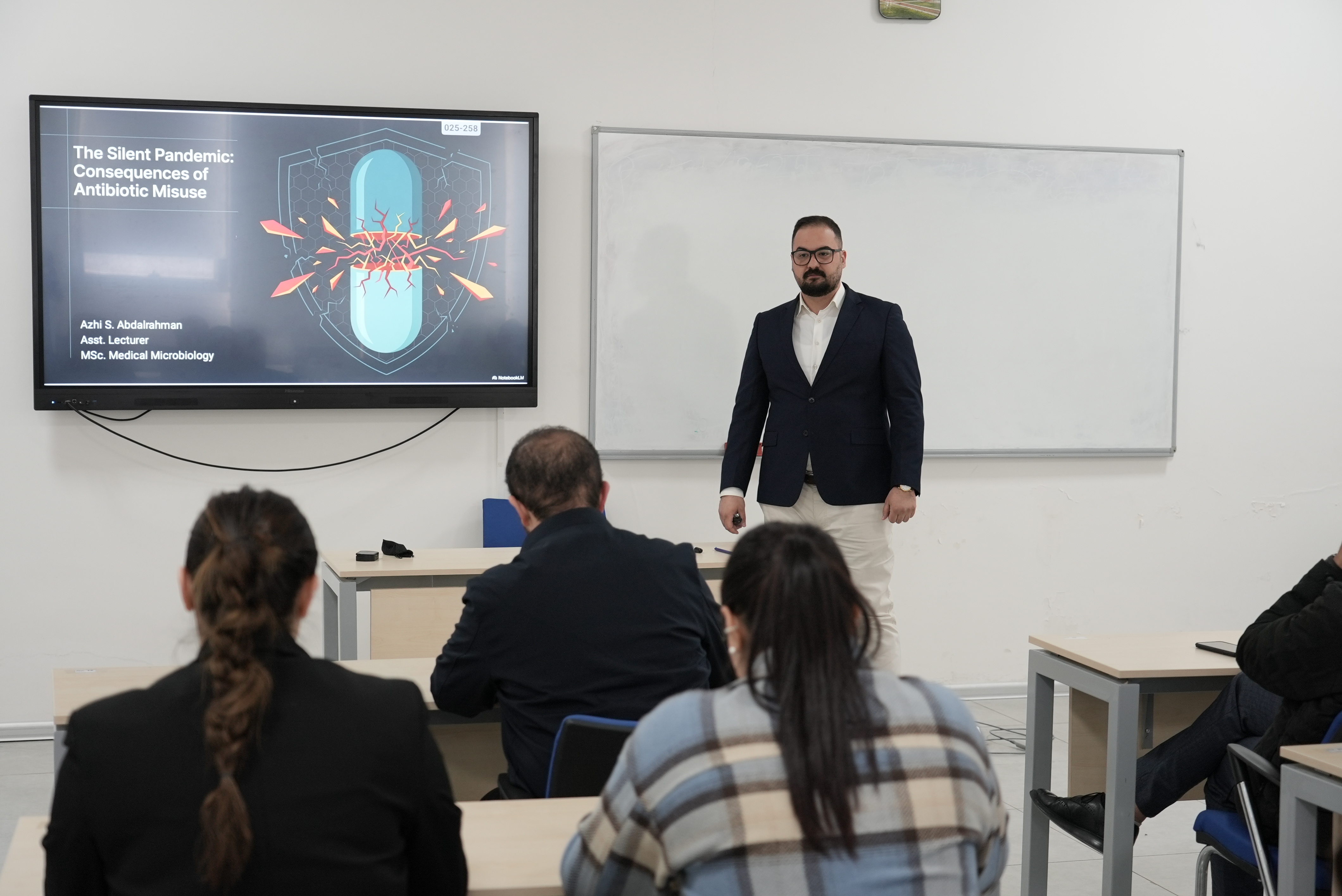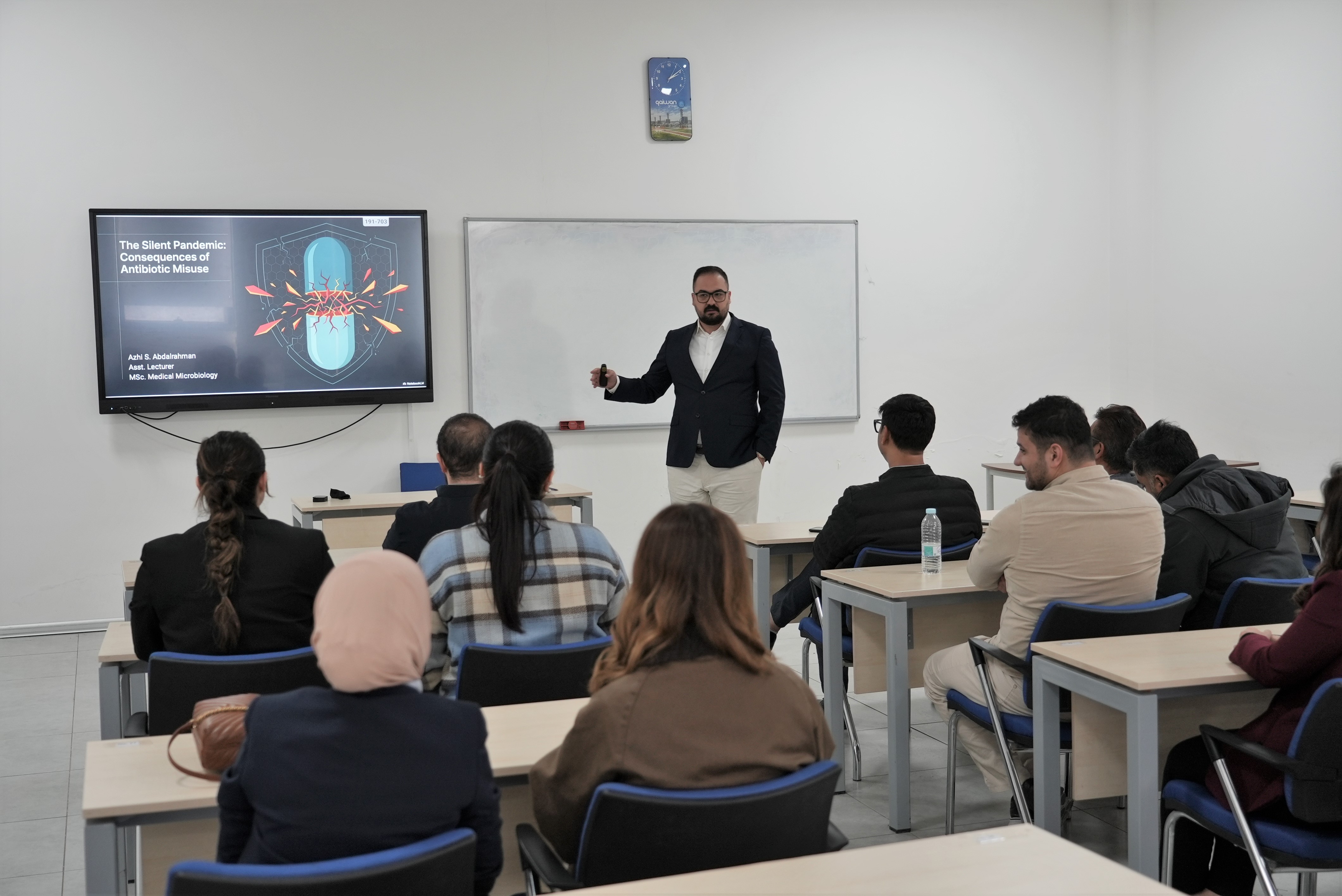 On April 16, 2026, Mr. Azhi Sarbast from the Faculty of Pharmacy delivered a seminar entitled “The Consequences of Antibiotic Misuse.” The session highlighted the critical implications of improper antibiotic use and emphasized the importance of responsible practices in safeguarding public health.
